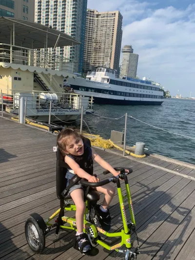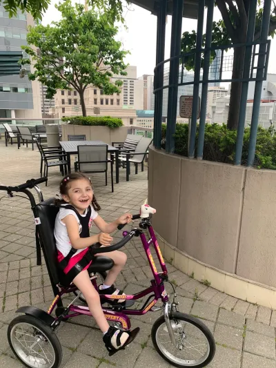 Giselle first tried a Freedom Concepts adaptive bike at school and liked it so much that Samah and Naser loaned a DCP 12 from the loaning program at Holland Bloorview Kids Rehabilitation Hospital.